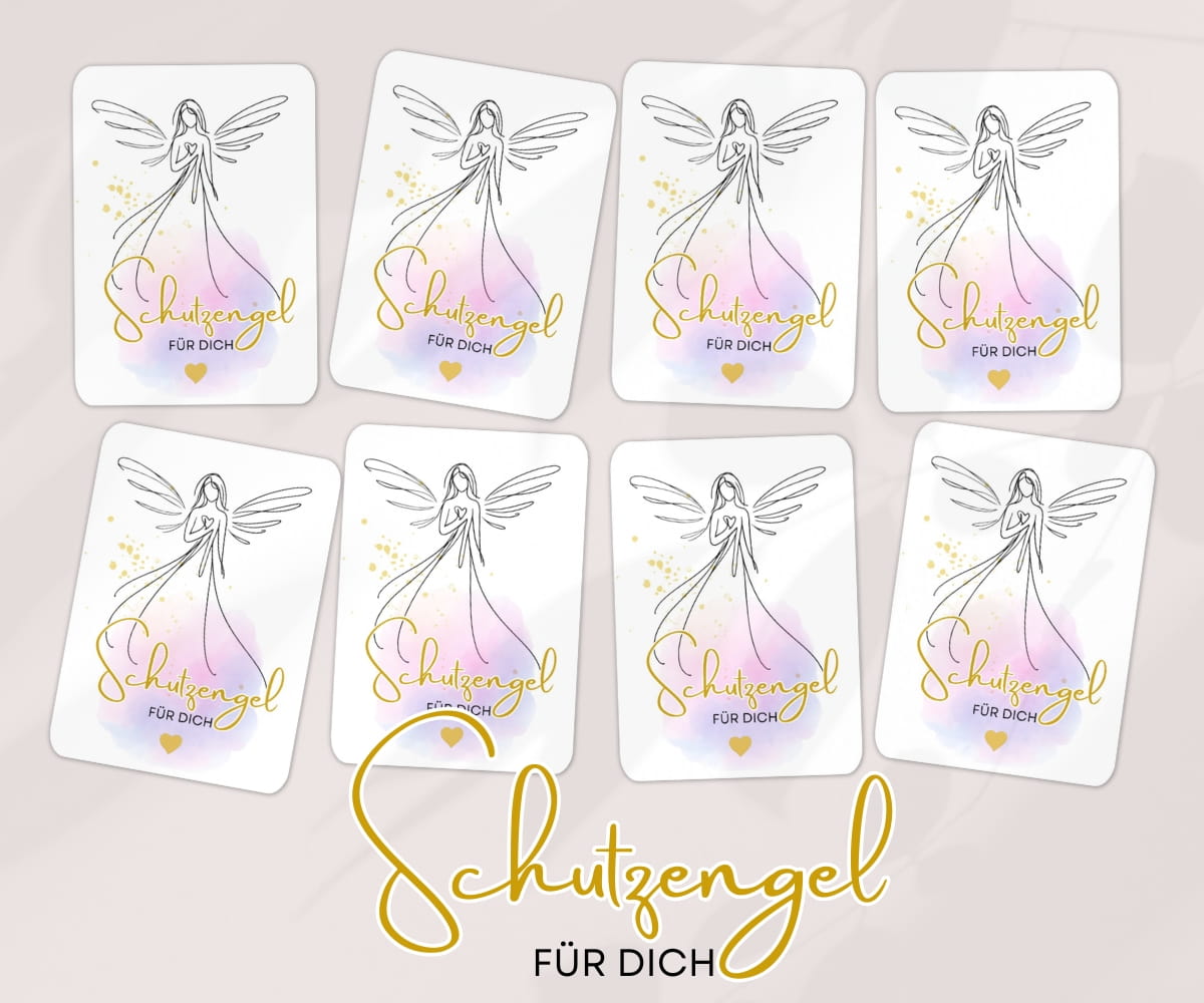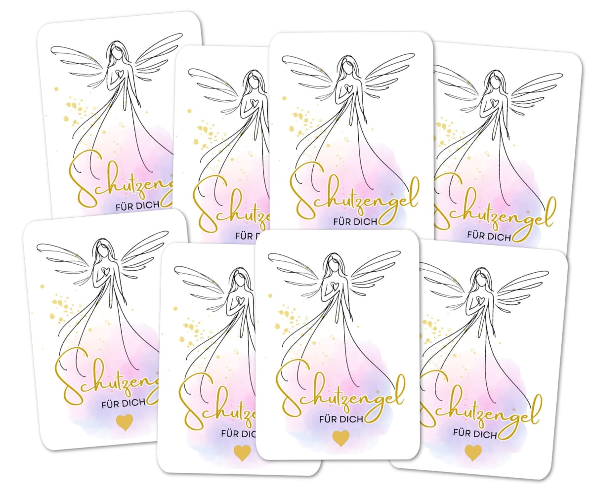 Jede Karte ist auf hochwertigem Tonkarton (11 × 8 cm) gedruckt, mit dem Text „Schutzengel für dich“ und einem glänzenden, goldenen Herz-Sticker veredelt.