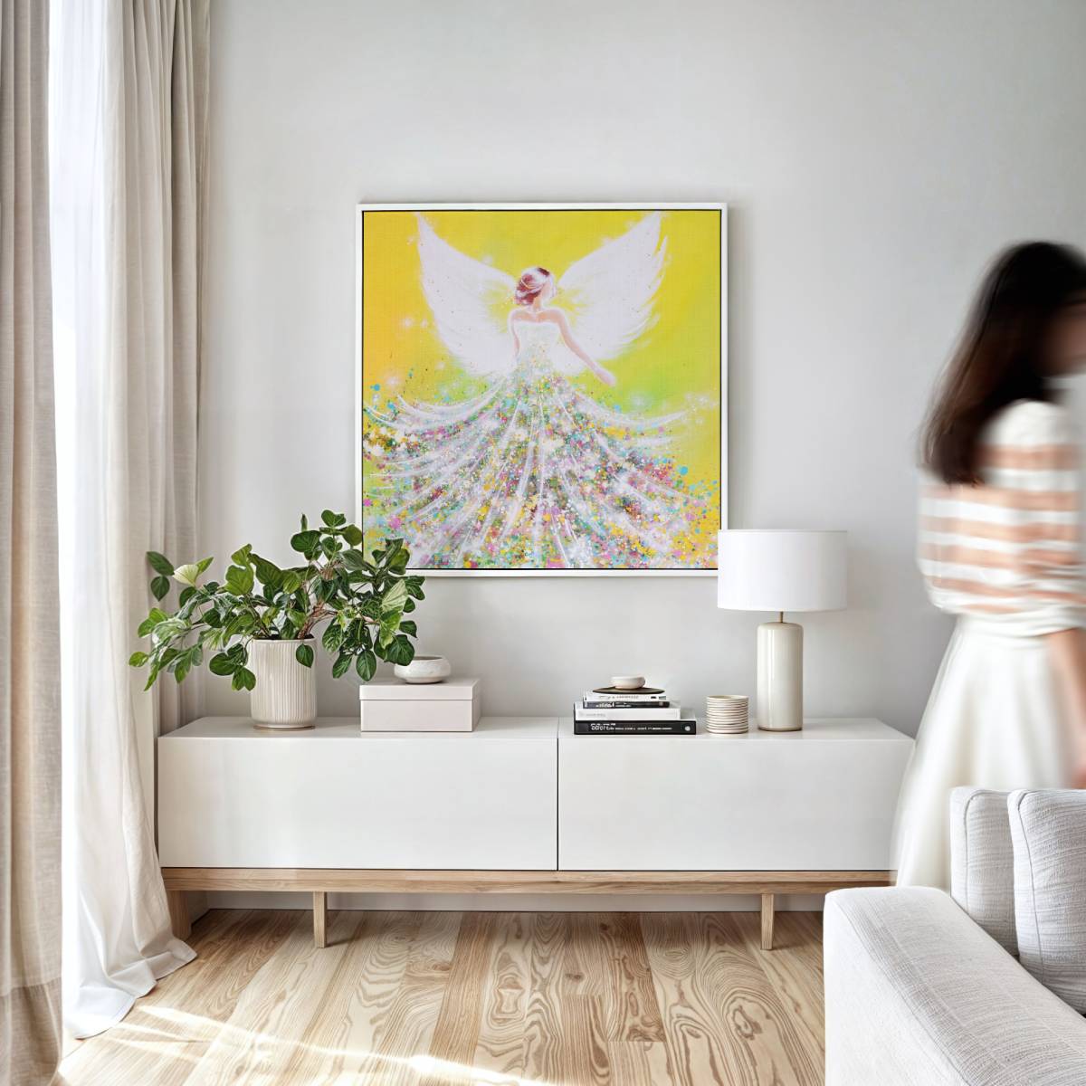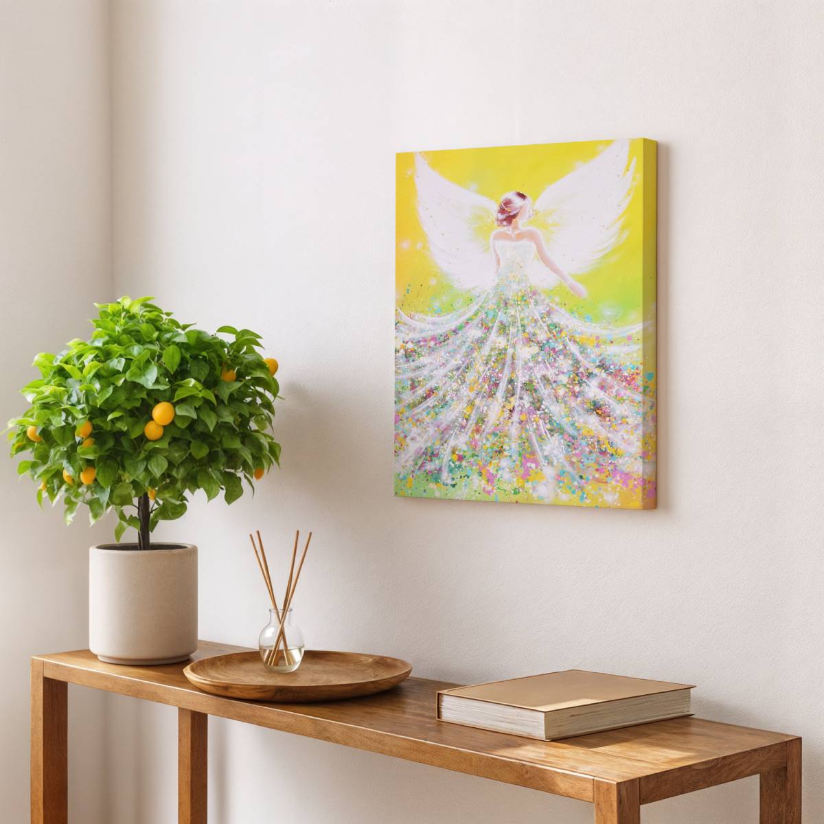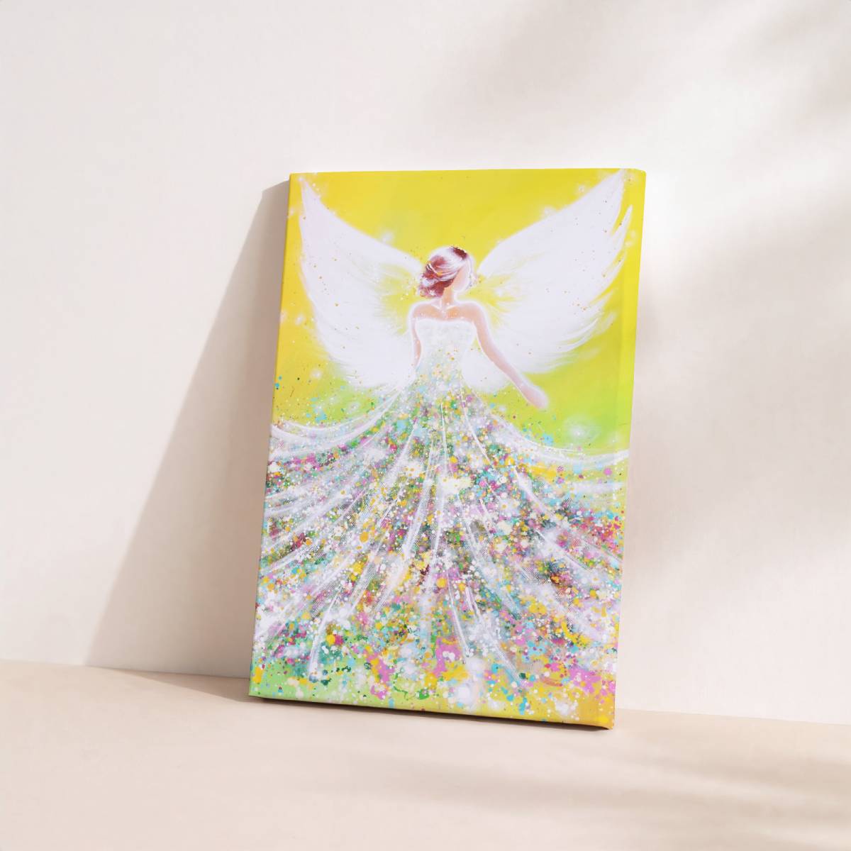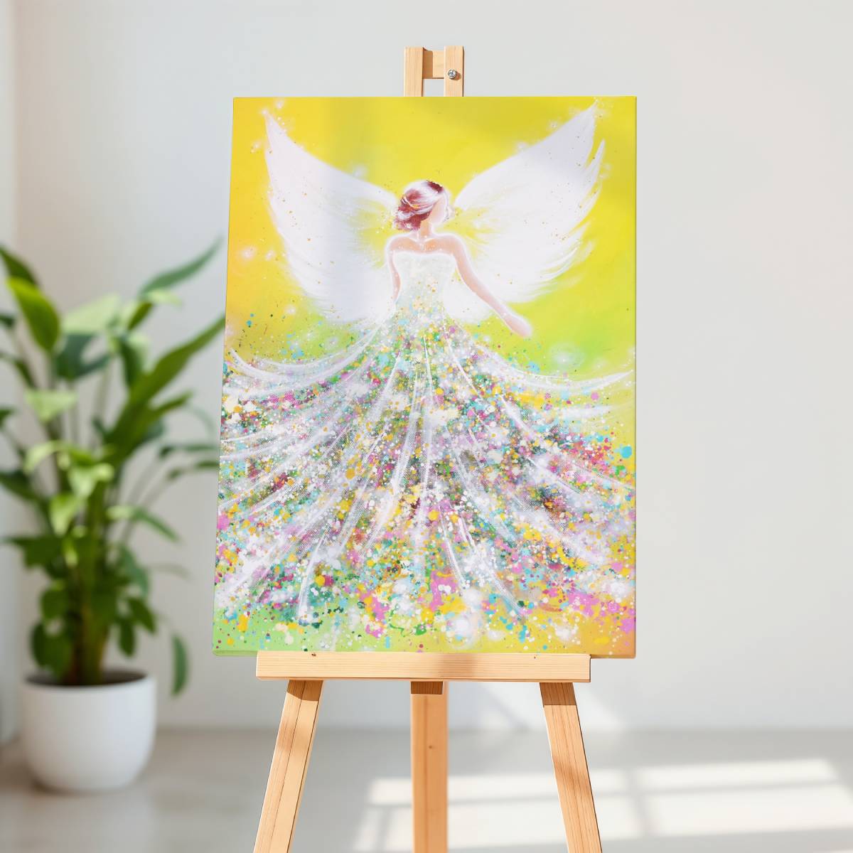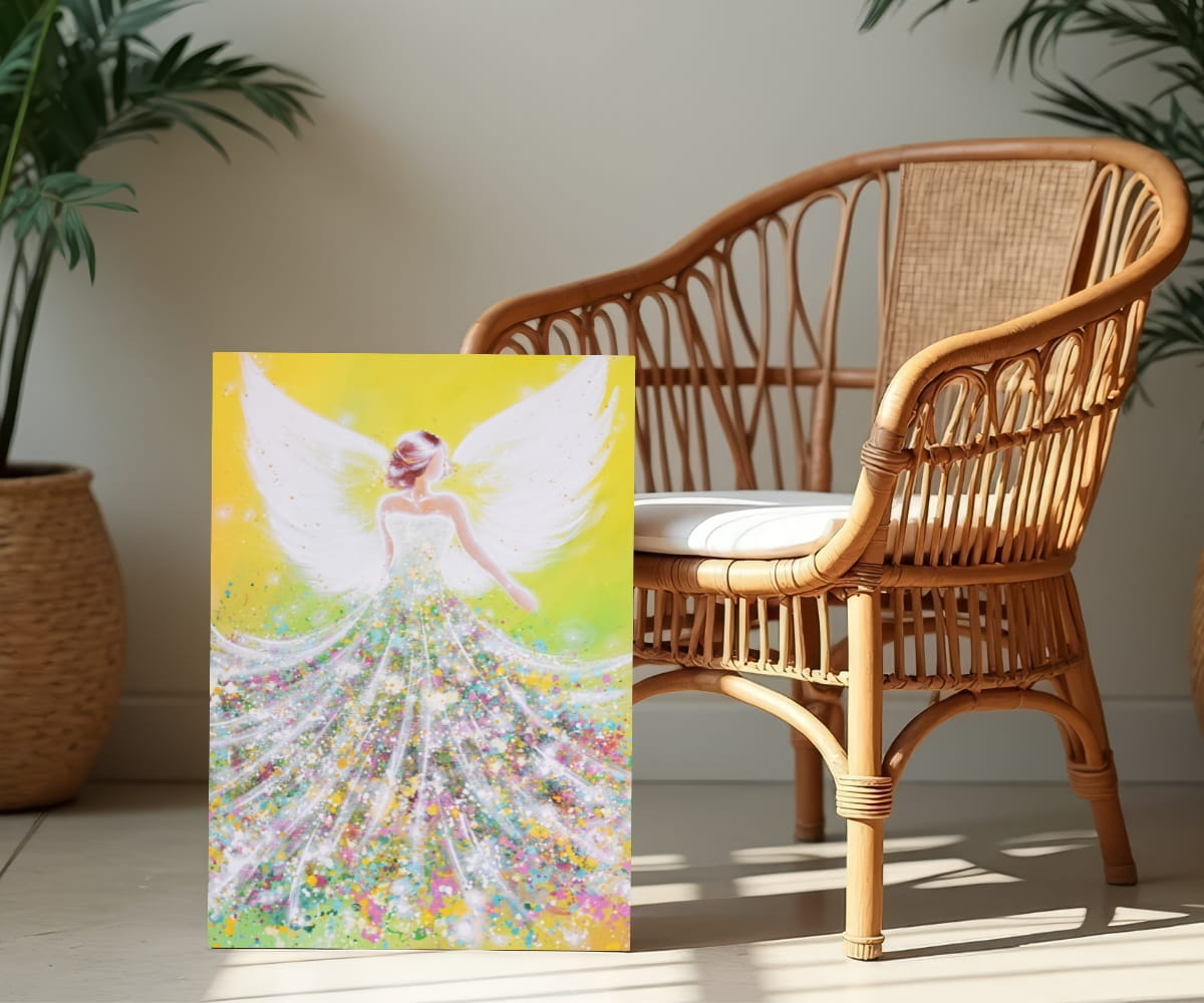 Dieses Engelbild leuchtet in warmem Gelb und frischem Grün, wie ein Neubeginn im Herzen.