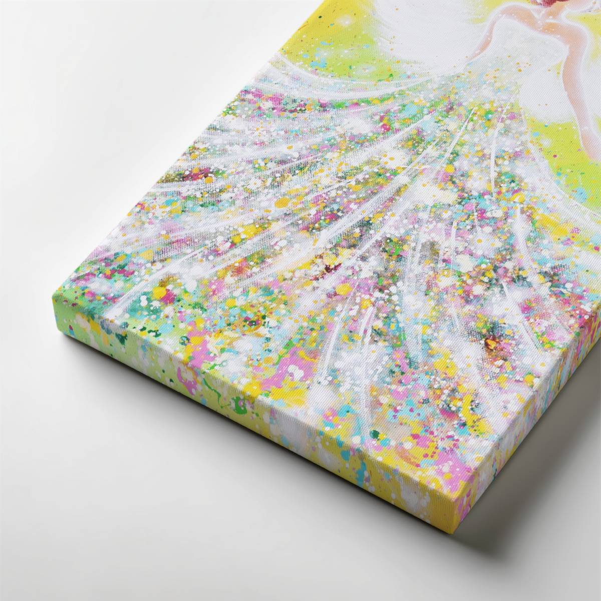 Der Engel breitet seine Flügel aus, während sich unter ihm ein Kleid aus bunten Blüten entfaltet – ein Sinnbild für Wachstum, Hoffnung und die Schönheit des Lebens.