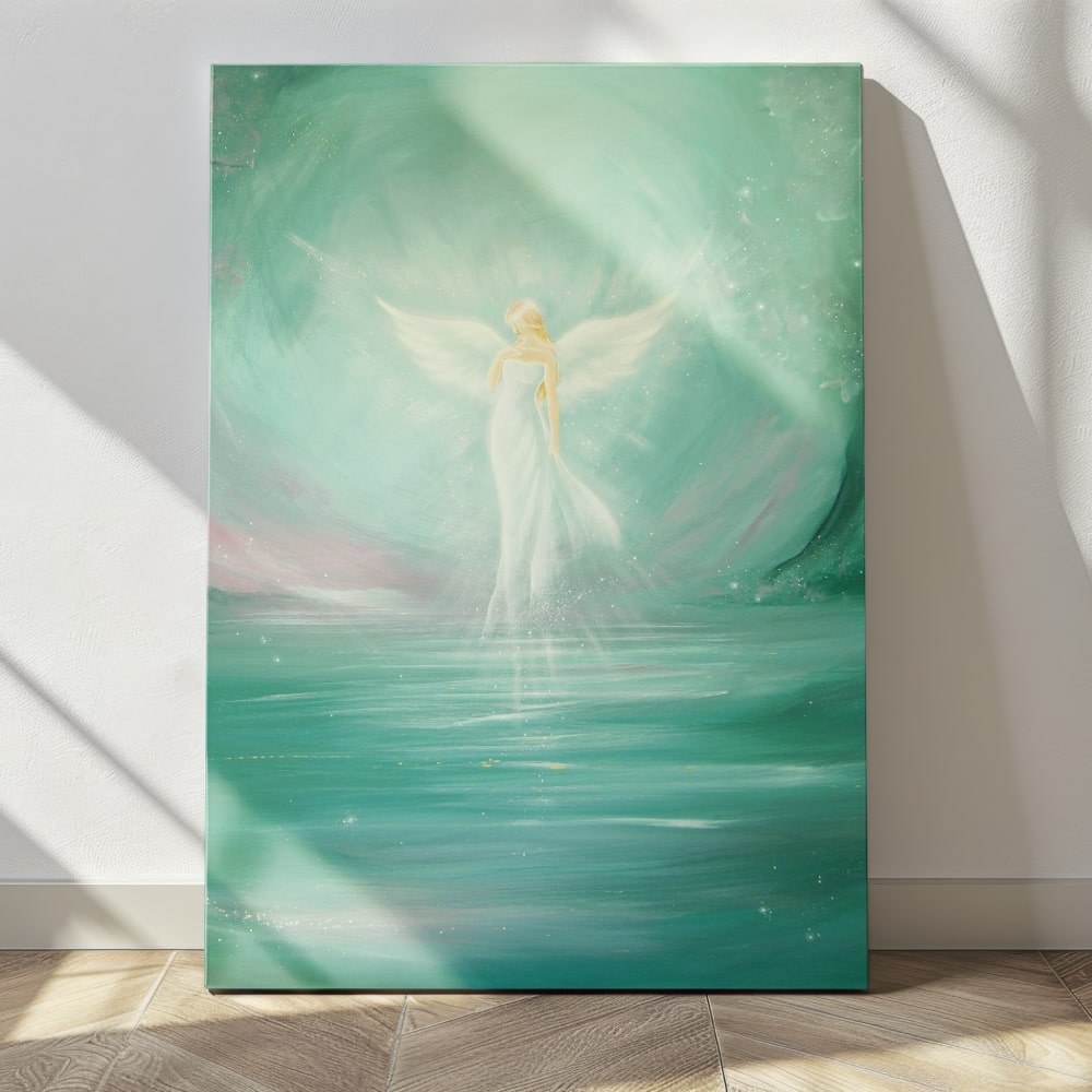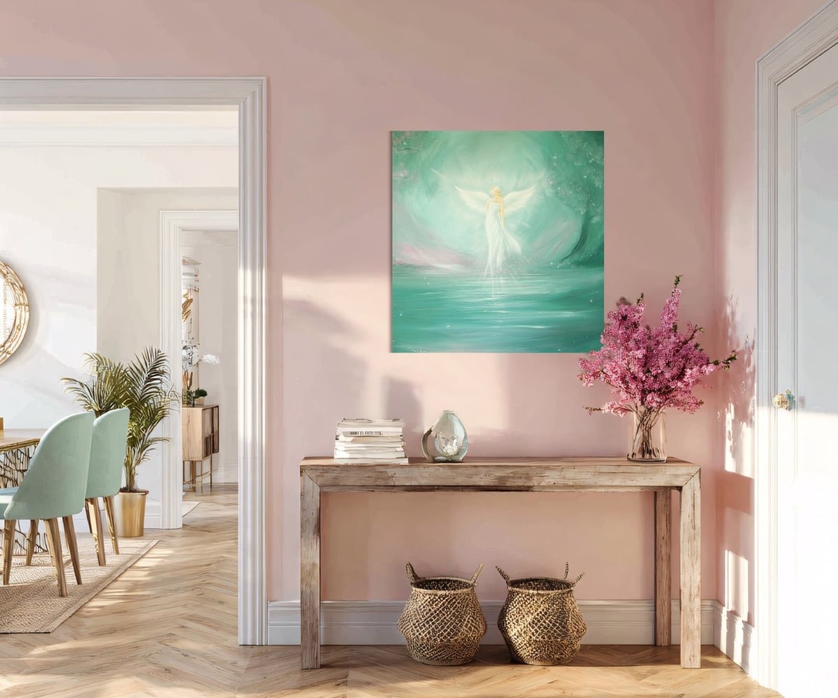 Dieses Schutzengel Wandbild erinnert daran, dass in jedem Moment ein Neubeginn liegt. Dass Wunder entstehen, wenn wir dem Licht in uns folgen – still, offen, ohne Eile.