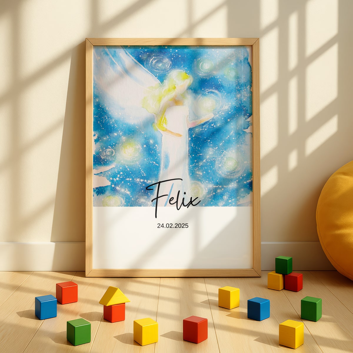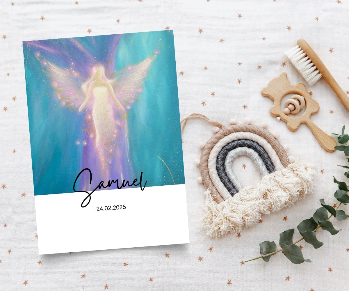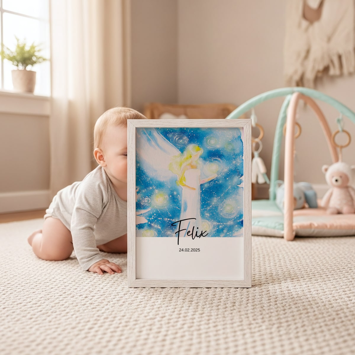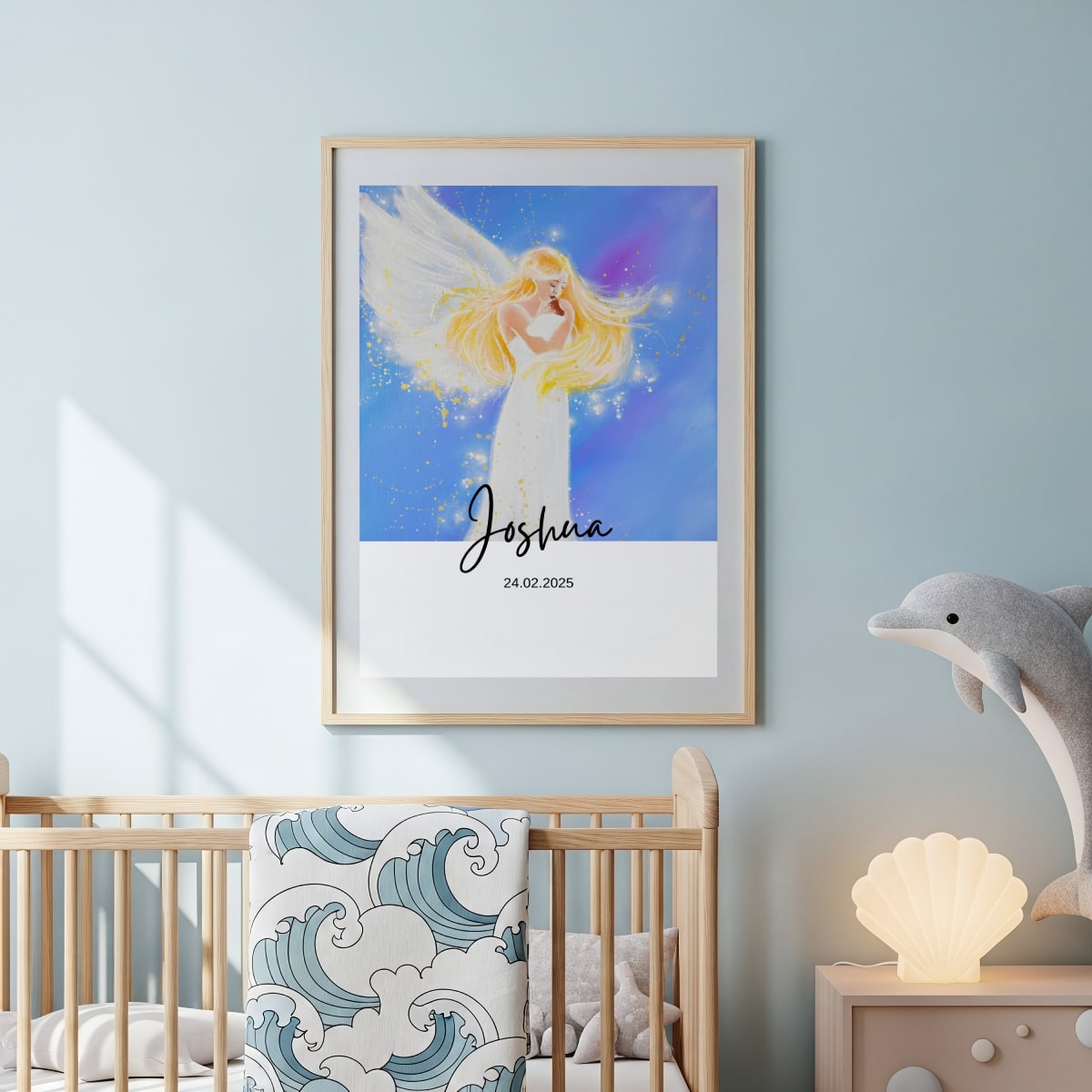 Mit deinem Wunschnamen und einem besonderen Datum (z. B. Taufe, Geburt oder Geburtstag) wird jedes Poster zu einem sehr persönlichen Erinnerungsstück. Ein Engel, der dein Kind behütet und mit seiner lichtvollen Botschaft Geborgenheit schenkt – einzigartig, wie der kleine Mensch, für den es bestimmt ist.