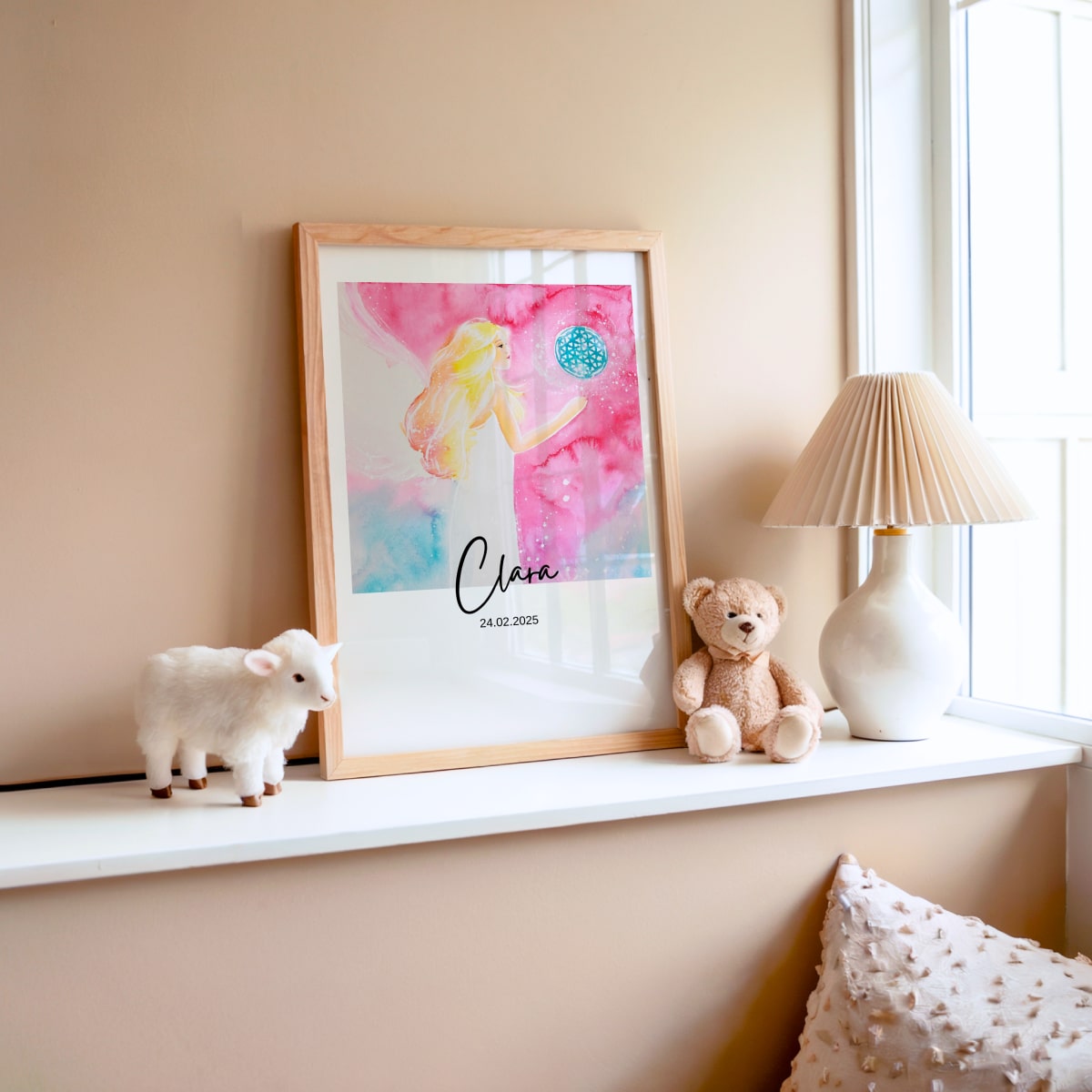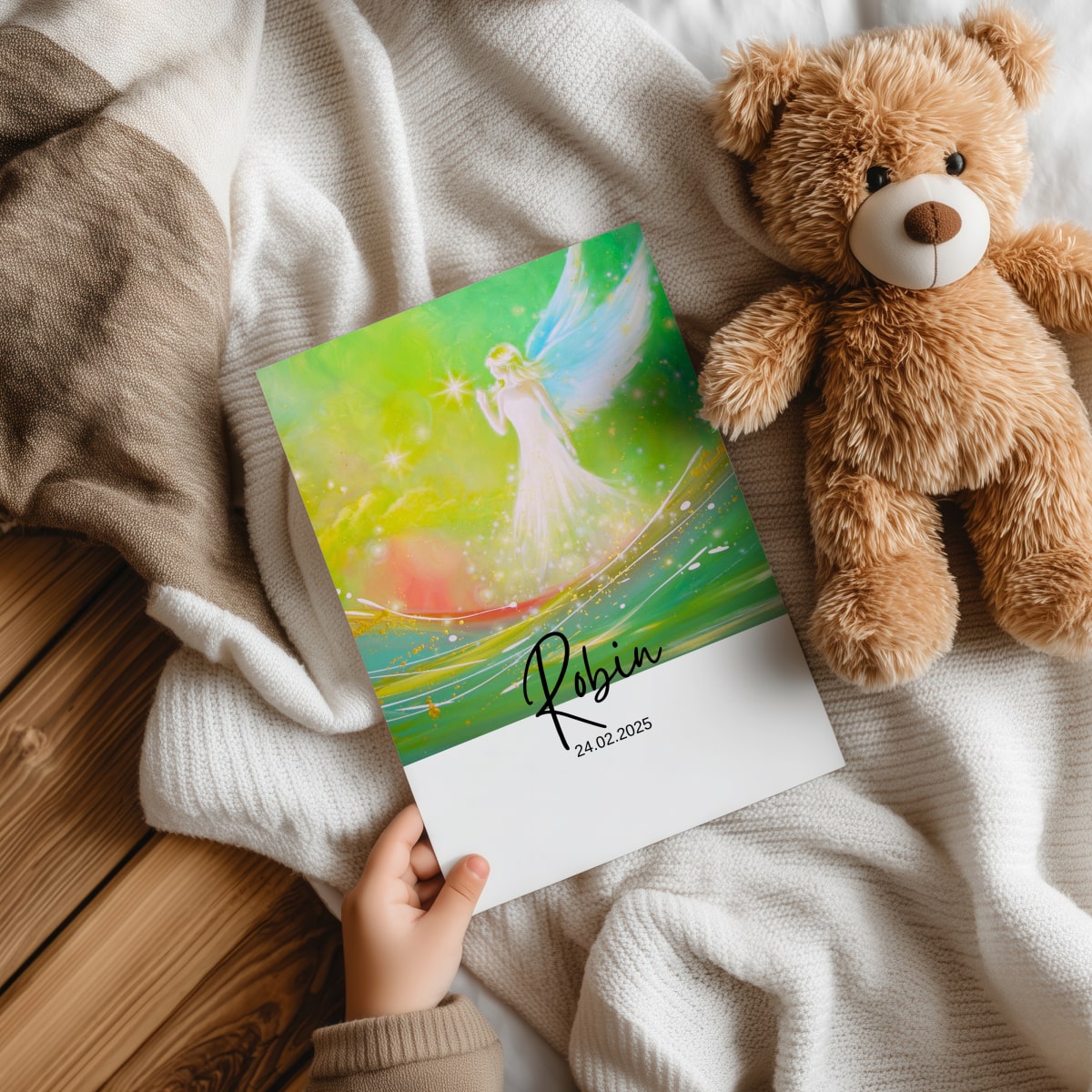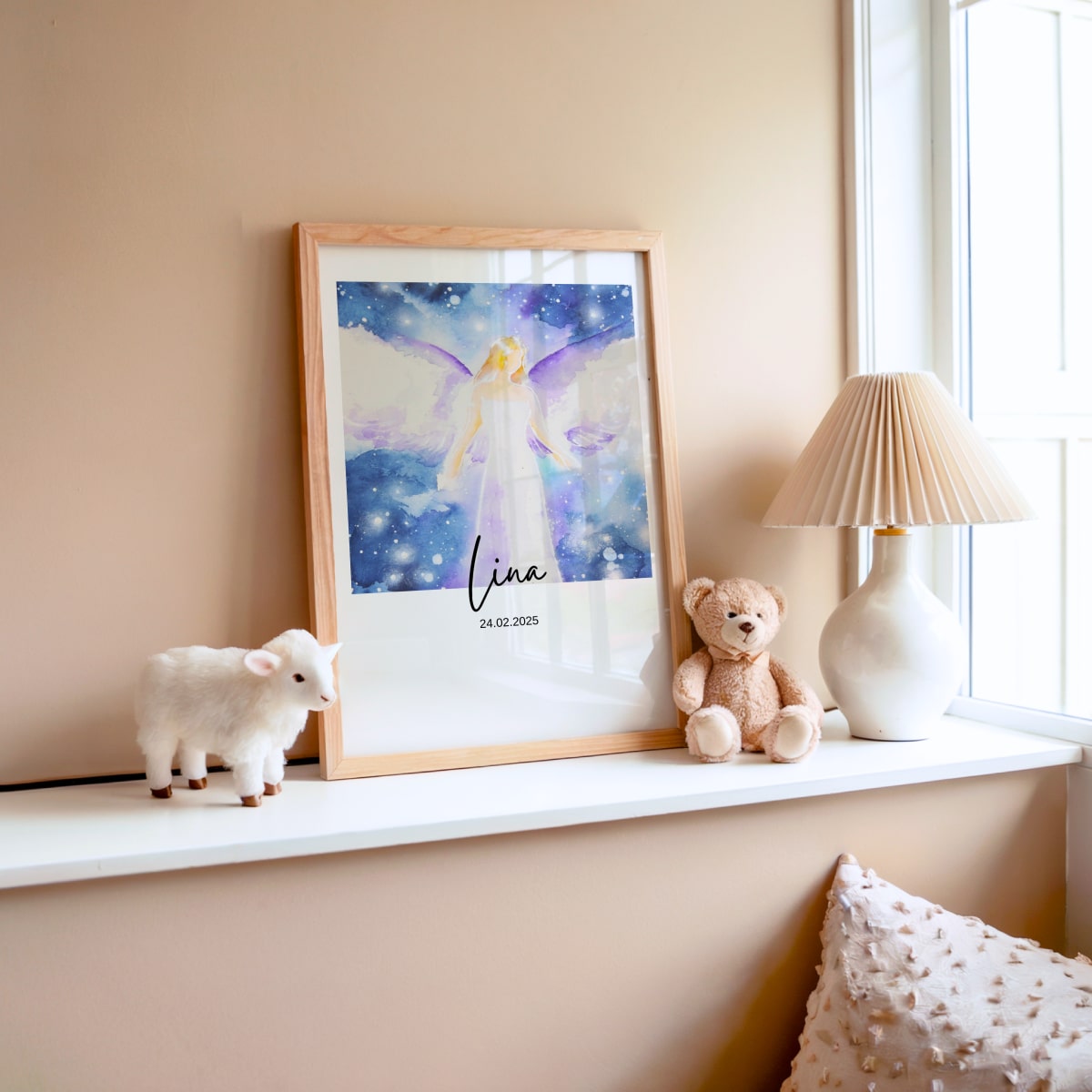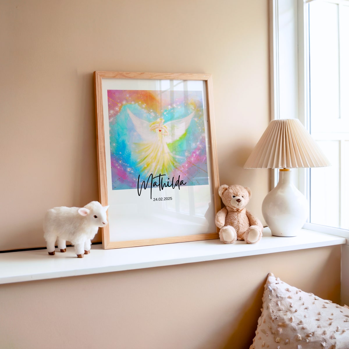 Mit deinem Wunschnamen und einem besonderen Datum (z. B. Taufe, Geburt oder Geburtstag) wird jedes Poster zu einem sehr persönlichen Erinnerungsstück. Ein Engel, der dein Kind behütet und mit seiner lichtvollen Botschaft Geborgenheit schenkt – einzigartig, wie der kleine Mensch, für den es bestimmt ist.