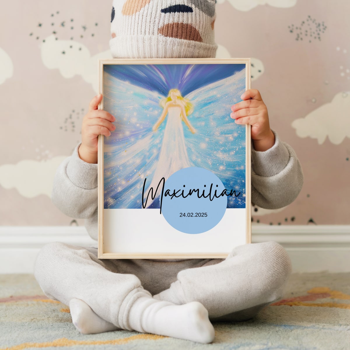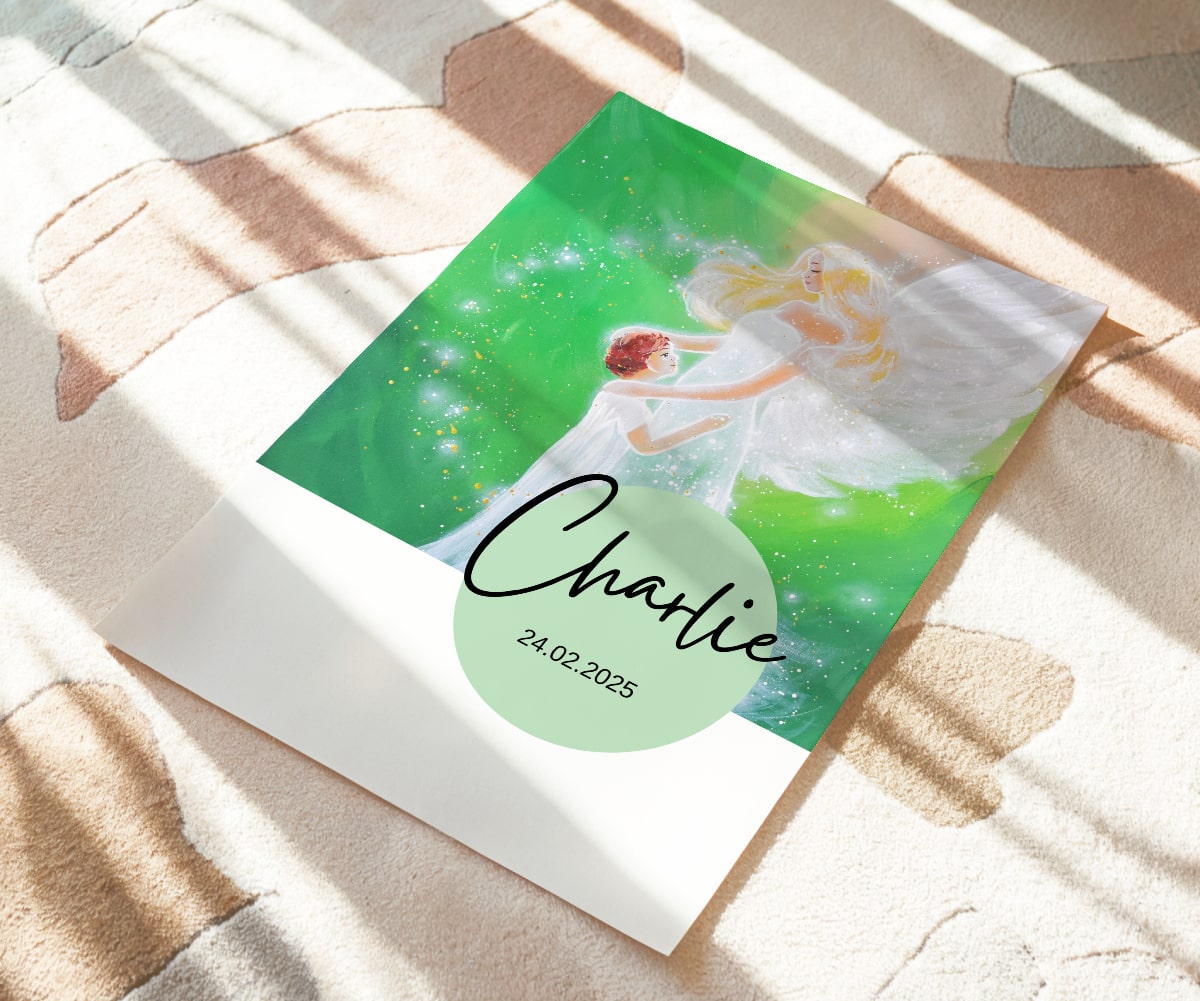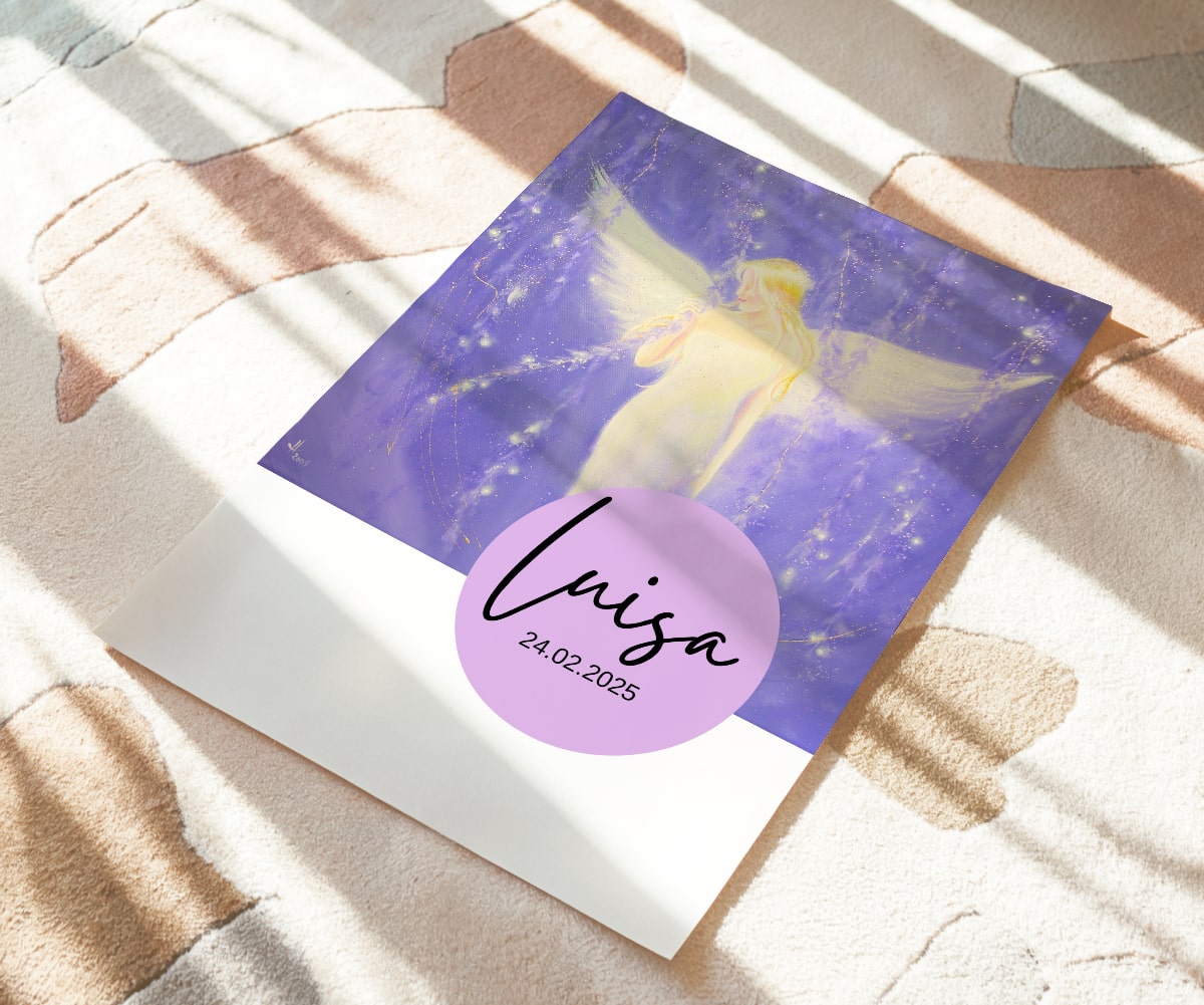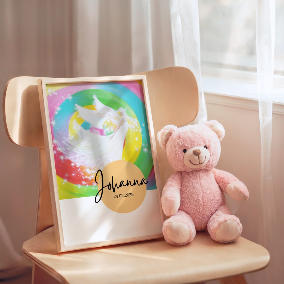 Für dein persönliches Poster schreibe ich den Namen und das besondere Datum deines Kindes in das Bild hinein. So wird daraus ein Erinnerungsstück voller Licht, Liebe und Geborgenheit – einzigartig, wie der kleine Mensch, für den es bestimmt ist.