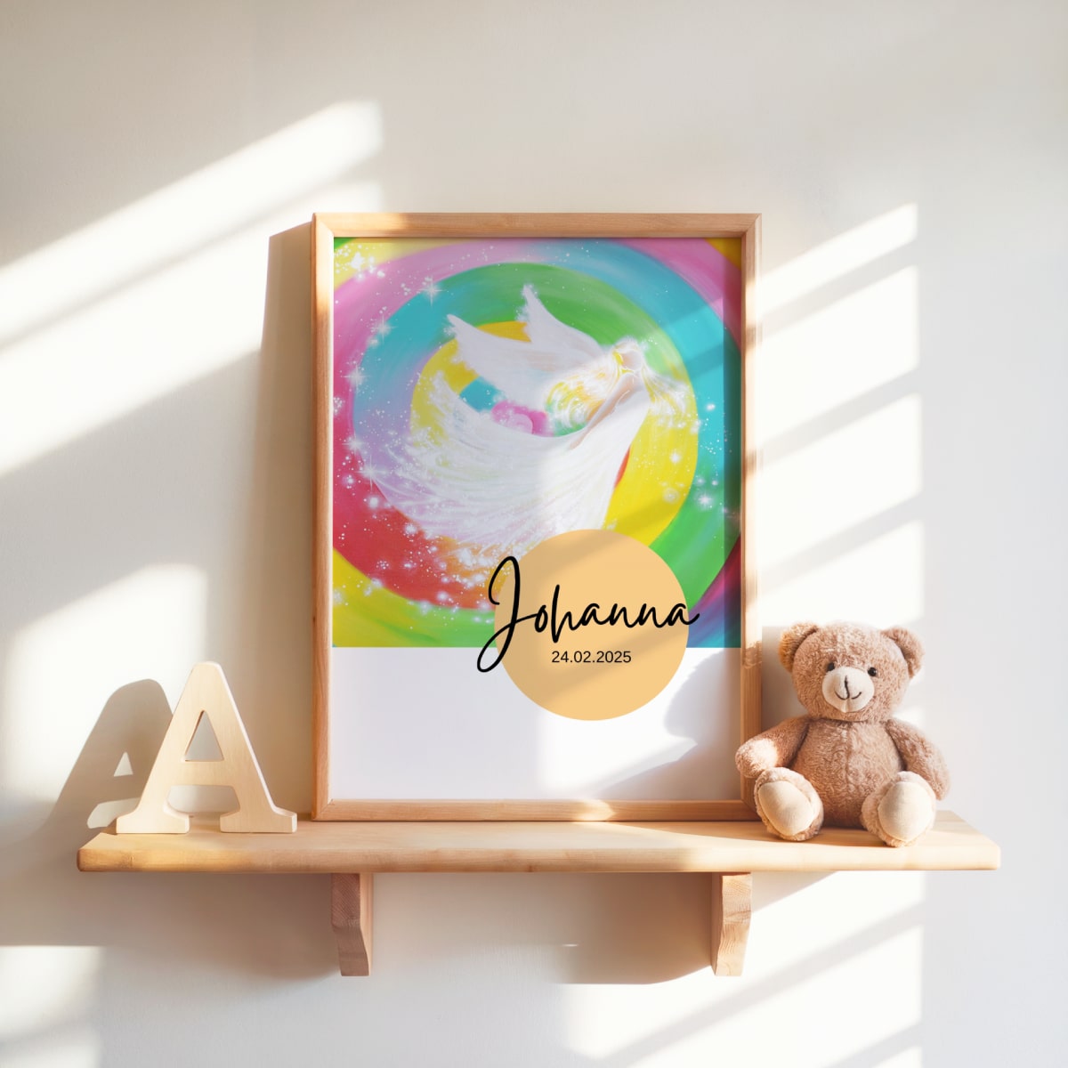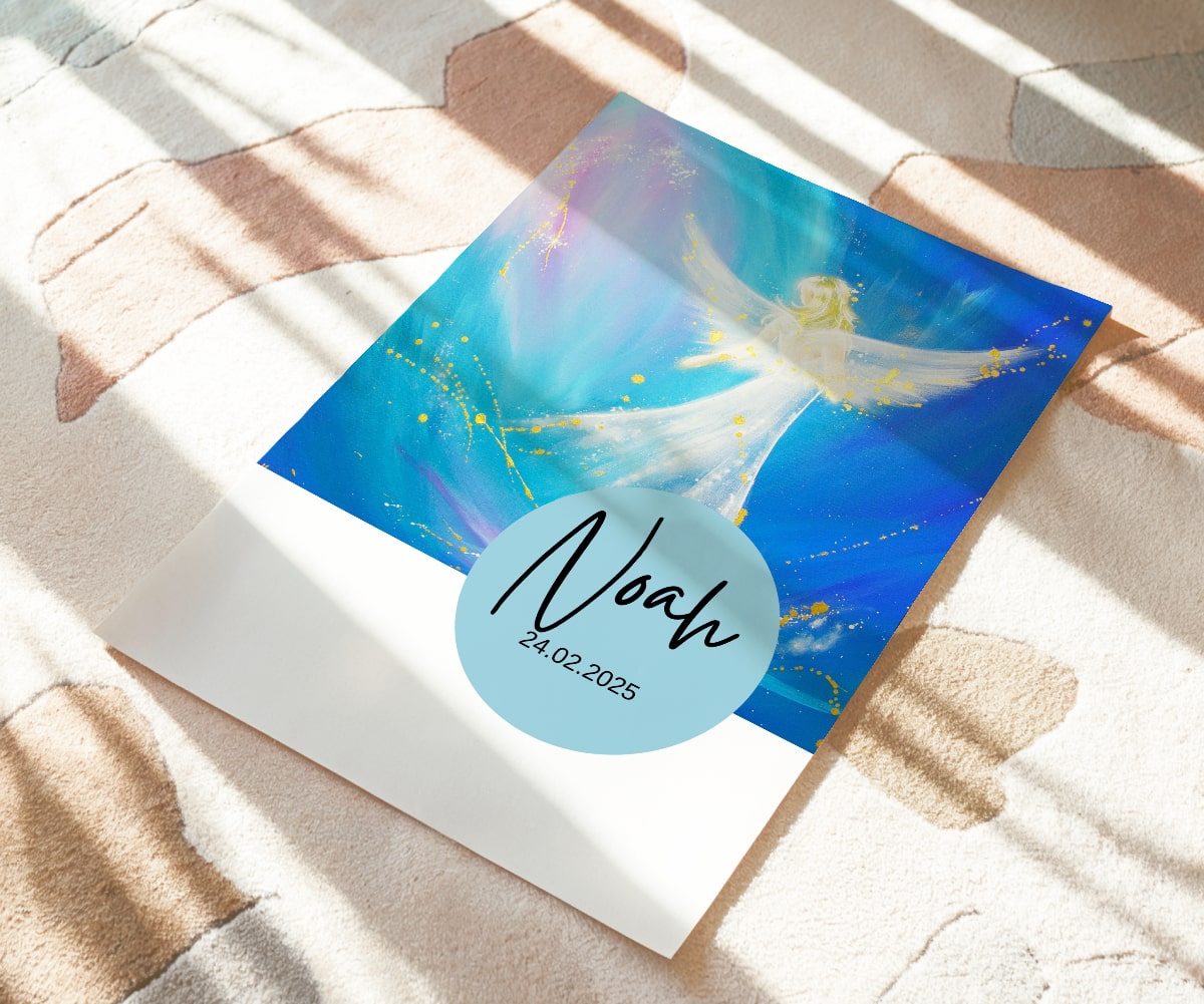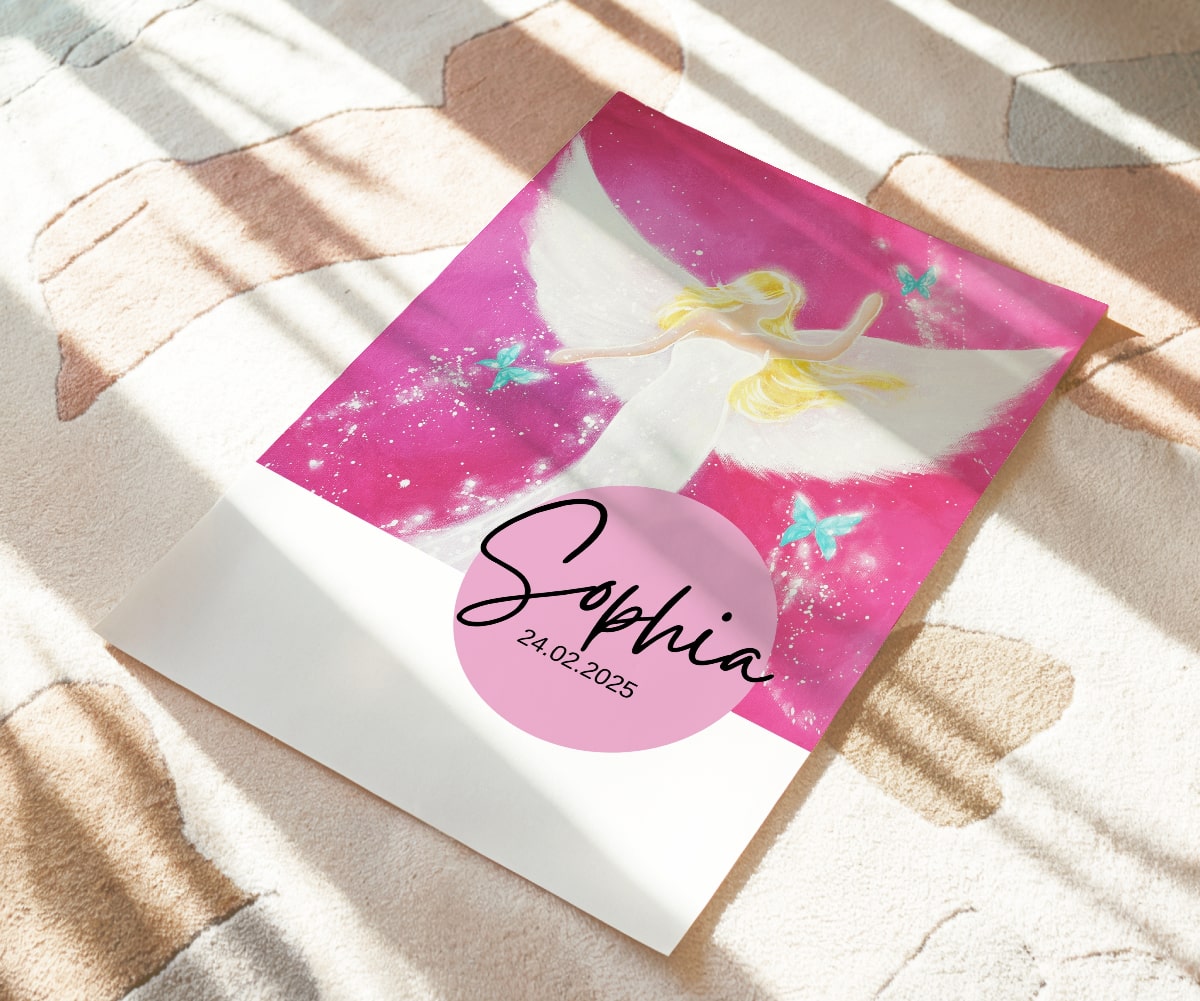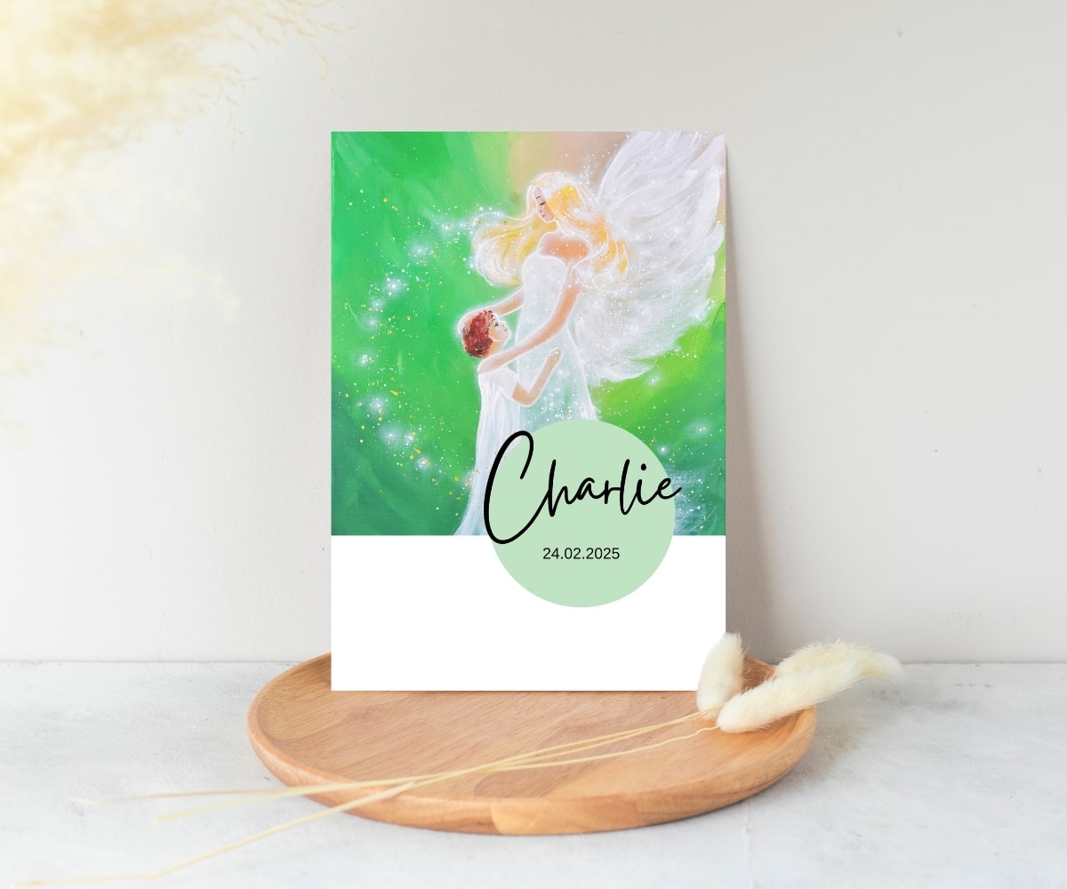 Für dein persönliches Poster schreibe ich den Namen und das besondere Datum deines Kindes in das Bild hinein. So wird daraus ein Erinnerungsstück voller Licht, Liebe und Geborgenheit – einzigartig, wie der kleine Mensch, für den es bestimmt ist.
