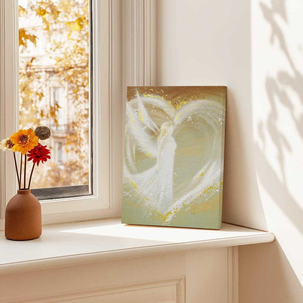 Ein besonderes Engelbild auf Leinwand, das Herz und Raum öffnet, als Schutzengelbild, liebevolles Geschenk zur Taufe oder Hochzeit, als spirituelle Wandkunst oder einfach für einen Herzensmenschen.