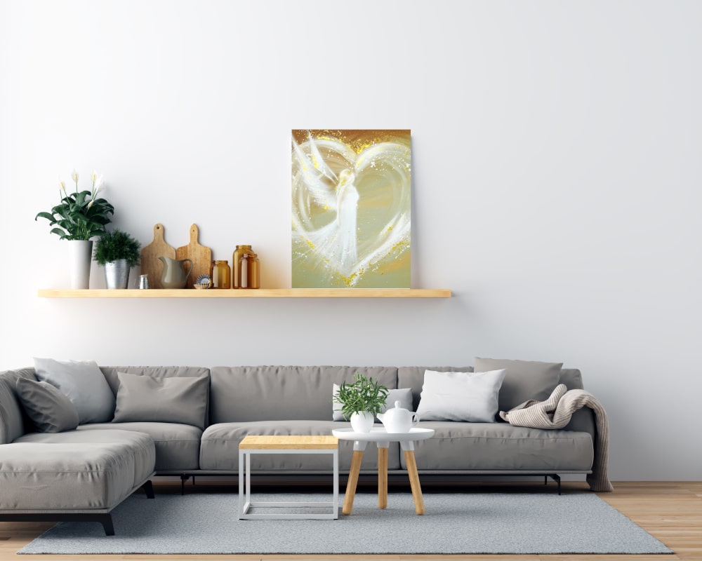 Das Engelbild ist auf hochwertiger Leinwand gedruckt und bringt eine warme, friedvolle Stimmung in dein Zuhause.